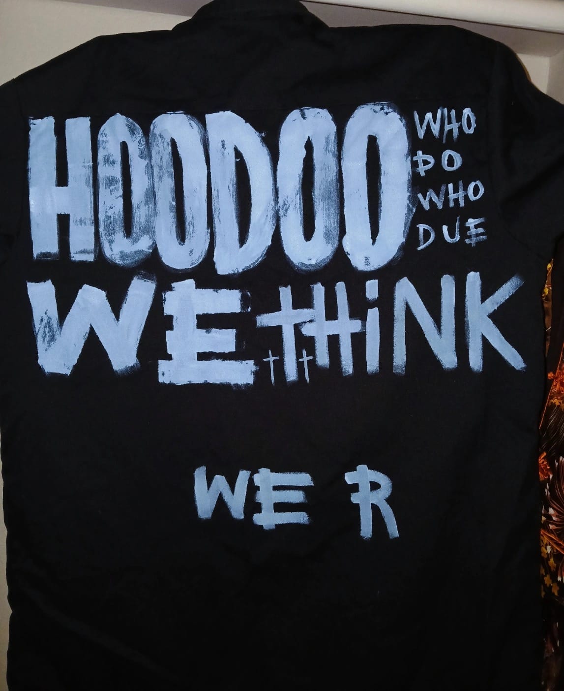 His newest project is a series of custom jackets embroidered with phrases like HOODOO We Think We R? The phrase isn’t just a provocation. It’s a reference to Hoodoo, a cultural and spiritual practice shaped by the African diaspora, southern Black Christianity, and resistance.