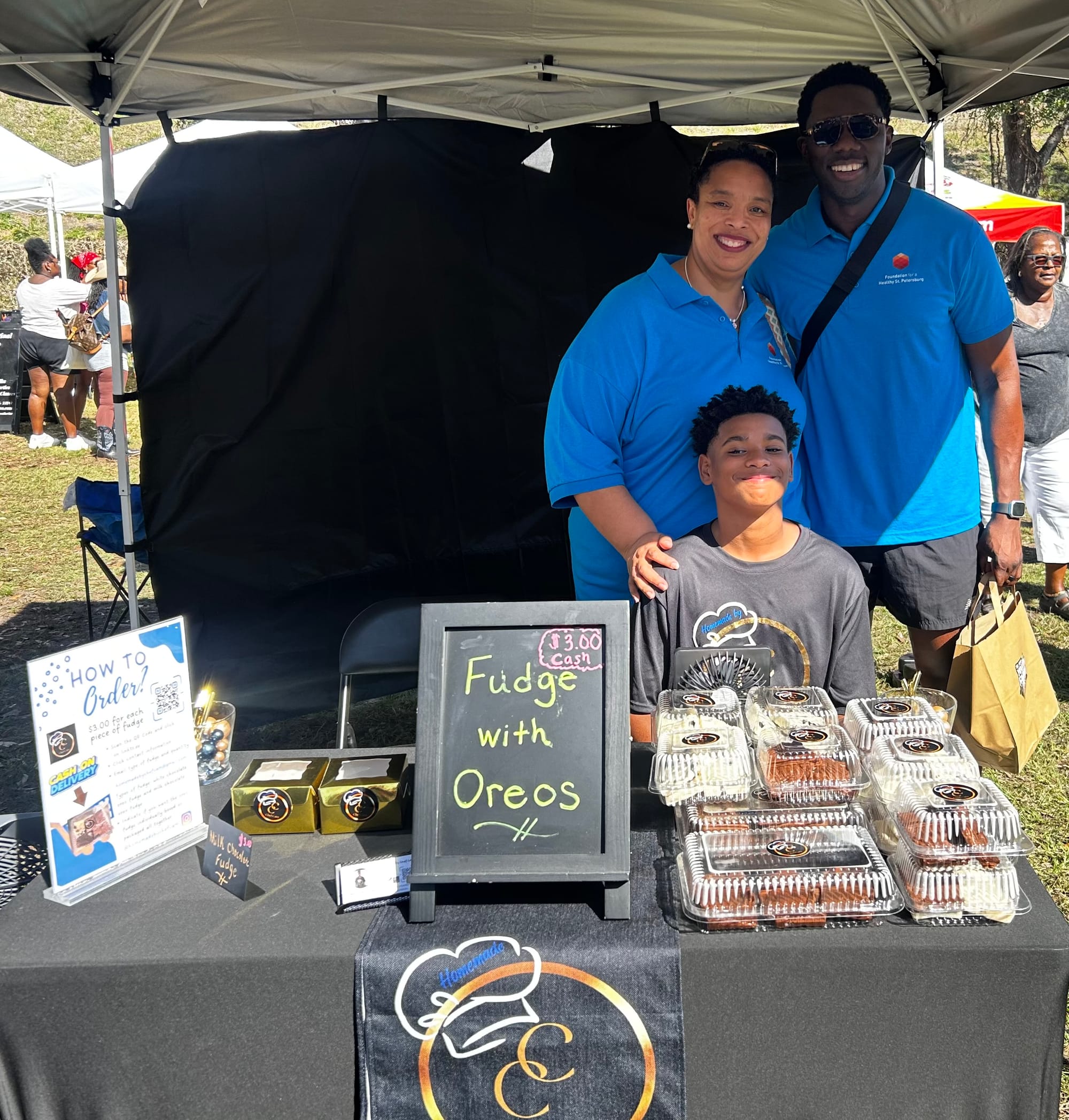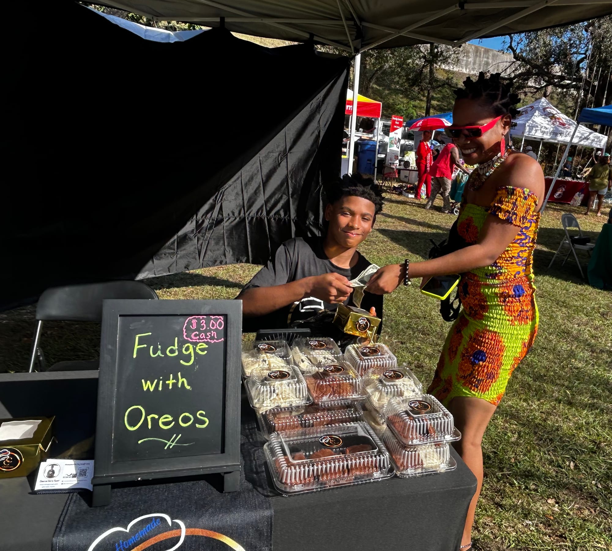 Cameron Harris sells homemade fudge at the Tampa Bay Collard Green Festival after completing the festival’s Youth Entrepreneurship Accelerator, a six-week program that prepares teens to launch real businesses and sell directly in their community. Cameron sold out of his products within hours of opening. His mother, Tameka Harris, said the experience helped him reinvest in his business and learn hands-on financial skills. Photo courtesy of Tameka Harris.