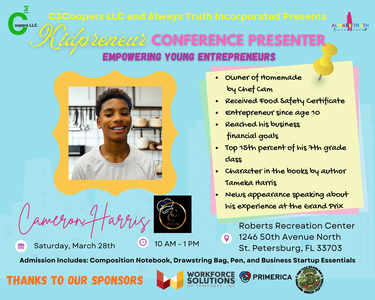 Presented with C3 Coopers LLC and Always Truth Incorporated, the conference brings together elementary, middle, and high school students alongside parents. They’ll learn how to create logos, file EINs, understand systems—and see other kids who look like them already doing it.