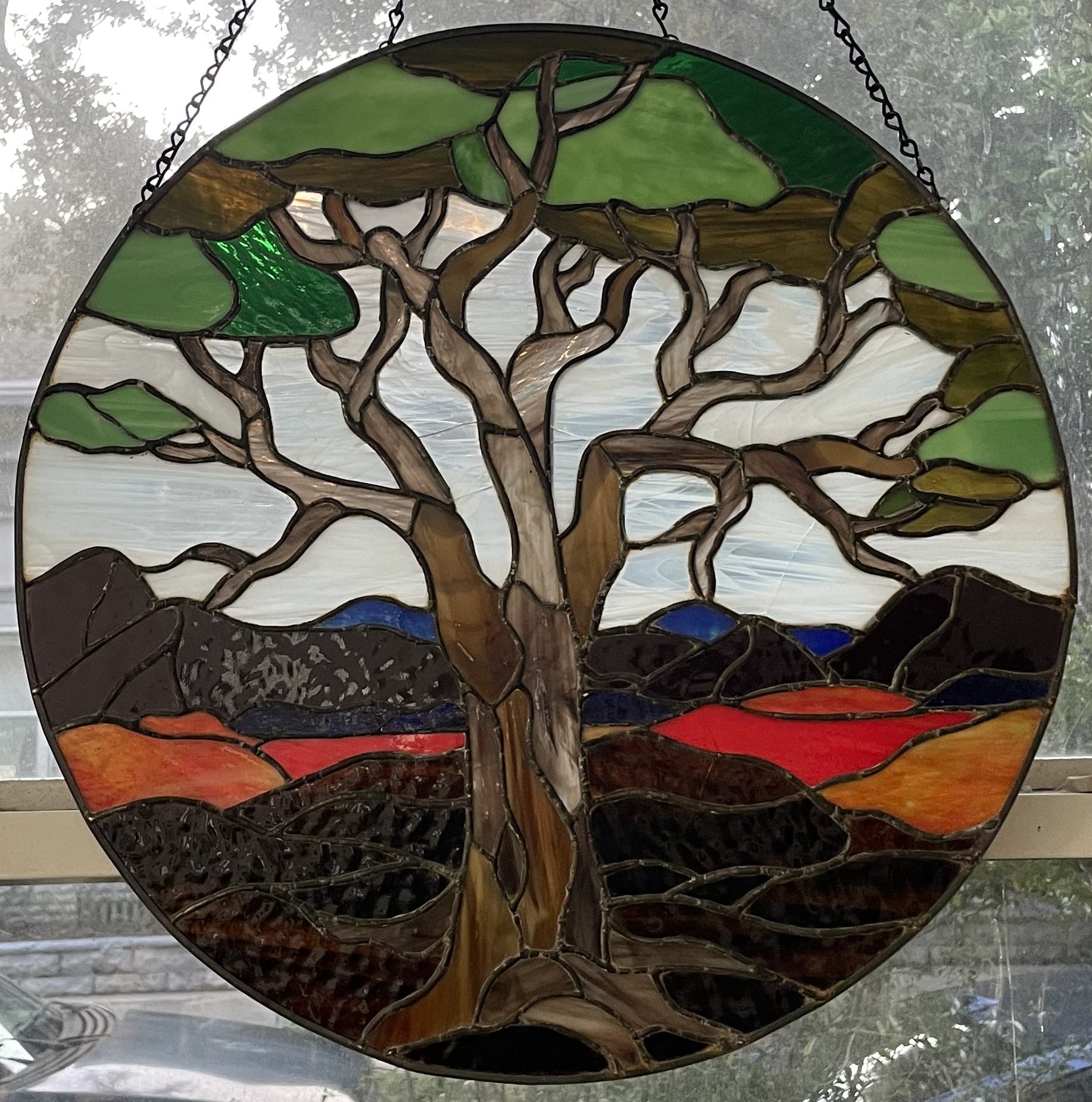 In the adjoining space, glass artists Jodi Chemes and Veronica Dunn build luminous circles of color and light — Chakra-inspired stained-glass pieces that converse directly with De’s painting Five Elements of Life. “Each color and sizing reflects the Chakras in the painting,” they explained. “From there, we chose an animal for each Chakra by thinking about its natural qualities.” A dragonfly, a snail — small creatures, large meanings. “Even when the glass is completely still, it feels like it’s moving,” they said. “It has its own energy.”