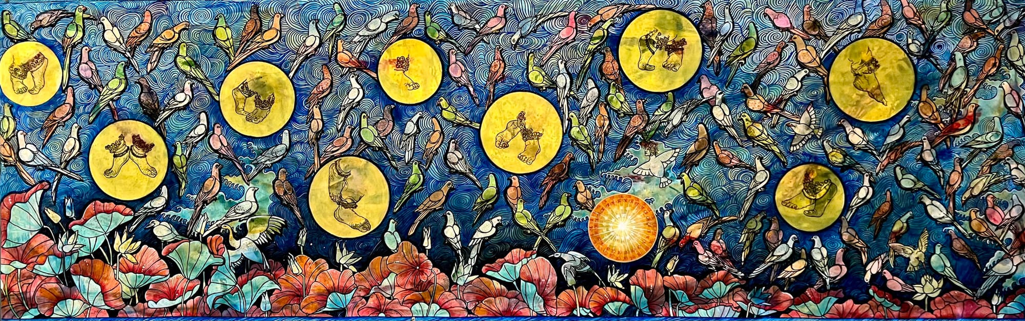 Her intricate linework and layered imagery blend prayer, psychology, and myth. She paints to quiet the mind, and her pieces set the spiritual tone for the exhibition. “Through meditation, I found that connection where silence becomes harmony with all that exists,” she said. “A relaxed mind gives birth to creation, and through creation I find relaxation.”